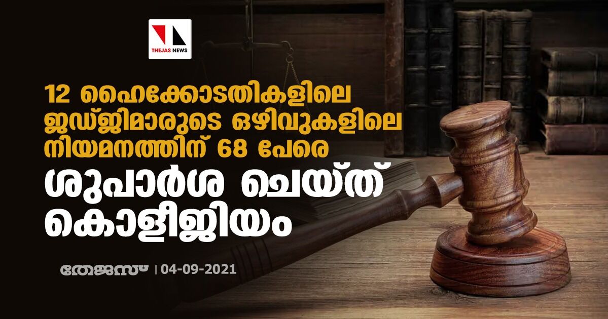 12 ഹൈക്കോടതികളിലെ ജഡ്ജിമാരുടെ ഒഴിവുകളിലെ നിയമനത്തിന് 68 പേരെ ശുപാർശ ചെയ്ത് കൊളീജിയം