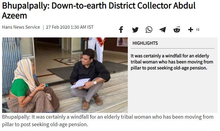 ഇതേ ചിത്രം 2020 ഫെബ്രുവരിയില് 'ദി ഹാന്സ് ഇന്ത്യ' ഒരു ലേഖനത്തില് പ്രസിദ്ധീകരിച്ചിരുന്നു. 'ജയശങ്കര് ഭൂപാല്പള്ളി' ജില്ലാ കലക്ടര് അബ്ദുല് അസീം ഓഫിസില് നിന്നിറങ്ങുമ്പോള് പടിയില് ഇരിക്കുന്ന വൃദ്ധയെ കാണുകയും കാര്യം അന്വേഷിക്കുകയും ചെയ്തു. തന്റെ വാര്ധക്യ പെന്ഷന് പ്രശ്നത്തെക്കുറിച്ച് അറിയിച്ചപ്പോള് ഉടന് തന്നെ കലക്ടര് അബ്ദുല് അസീം ഡിആര്ഡിഒ സുമതിയോട് സംസാരിക്കുകയും മംഗമ്മ എന്ന സ്ത്രീക്ക് പെന്ഷന് ലഭിക്കുമെന്ന് ഉറപ്പാക്കുകയും ചെയ്തു എന്നാണ് റിപോര്ട്ടിലുള്ലത്.