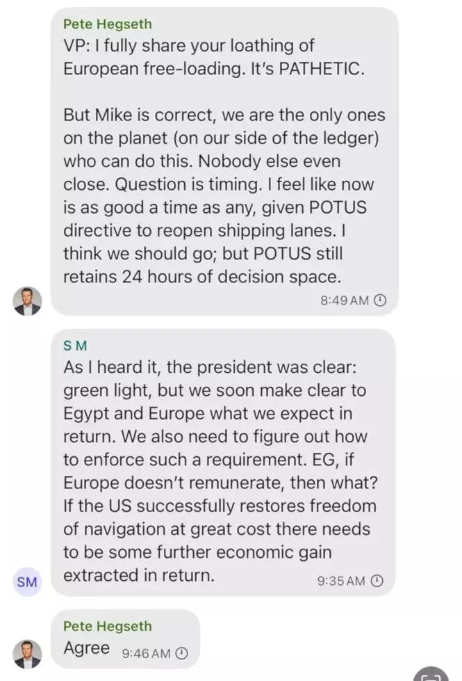 എന്നാല്, ഹെഗ്സെത്തും വാള്ട്ട്സും ഉള്പ്പെടെയുള്ളവര് ഉടന് ആക്രമണം നടത്തണമെന്ന നിലപാടുള്ളവരായിരുന്നു. കുറച്ച് ആഴ്ചകളോ ഒരു മാസമോ കാത്തിരിക്കുന്നത് കൊണ്ട് പ്രത്യേകിച്ച് ഗുണമില്ലെന്നാണ് ഹെഗ്സെത്ത് പറഞ്ഞത്. യെമന് ആക്രമണത്തിന് ഡോണള്ഡ് ട്രംപ് പച്ചക്കൊടി കാട്ടിയെന്ന് സ്റ്റീഫന് മില്ലര് പറയുന്നുണ്ട്. ഹൂത്തികളെ ആക്രമിക്കുന്നതിലൂടെ ഈജിപ്തിനും യൂറോപ്പിനുമുണ്ടാവുന്ന നേട്ടങ്ങളെ കുറിച്ചും പരാമര്ശമുണ്ട്. മാര്ച്ച് പതിനഞ്ചിന് രാവിലെ 11.44നാണ് പീറ്റ് ഹെഗ്സെത്ത് ആക്രമണത്തിന് നിര്ദേശം നല്കിയത്. പിന്നീട് സന്ആയില് ബോംബിട്ടതിനെ കുറിച്ചും ചാറ്റുകള് പറയുന്നുണ്ട്.