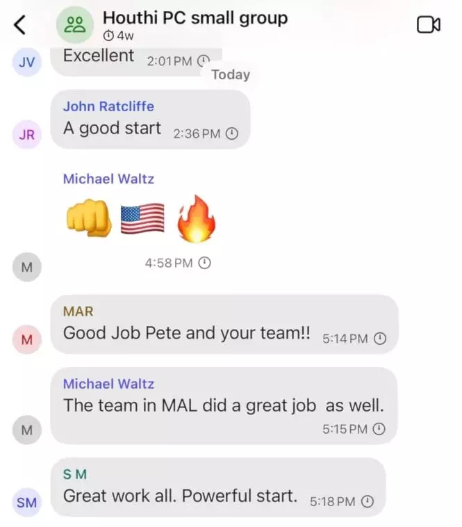 'ഹൂത്തി പിസി സ്മോള് ഗ്രൂപ്പ്' എന്ന പേരിലുള്ള ഗ്രൂപ്പില് യുഎസ് വൈസ് പ്രസിഡന്റ് ജെ ഡി വാന്സ്, യുഎസ് സെക്രട്ടറി ഓഫ് സ്റ്റേറ്റ് മാര്ക്കോ റൂബിയോ, ഇന്റലിജന്സ് വിഭാഗം മേധാവി തുള്സി ഗബ്ബാര്ഡ്, വൈറ്റ് ഹൗസ് ഡെപ്യൂട്ടി ചീഫ് ഓഫ് സ്റ്റാഫ് സ്റ്റീഫന് മില്ലര്, പ്രതിരോധ സെക്രട്ടറി പീറ്റ് ഹെഗ്സെത്ത്, ദേശീയ സുരക്ഷാ ഉപദേഷ്ടാവ് മൈക്കിള് വാള്ട്ട്സ് തുടങ്ങിവരാണ് ഉണ്ടായിരുന്നത്.