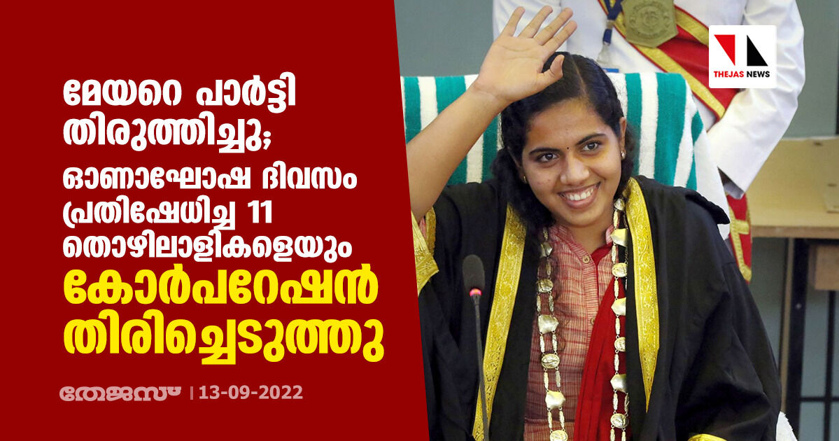 മേയറെ പാർട്ടി തിരുത്തിച്ചു; ഓണാഘോഷ ദിവസം പ്രതിഷേധിച്ച 11 തൊഴിലാളികളെയും കോര്പറേഷന് തിരിച്ചെടുത്തു