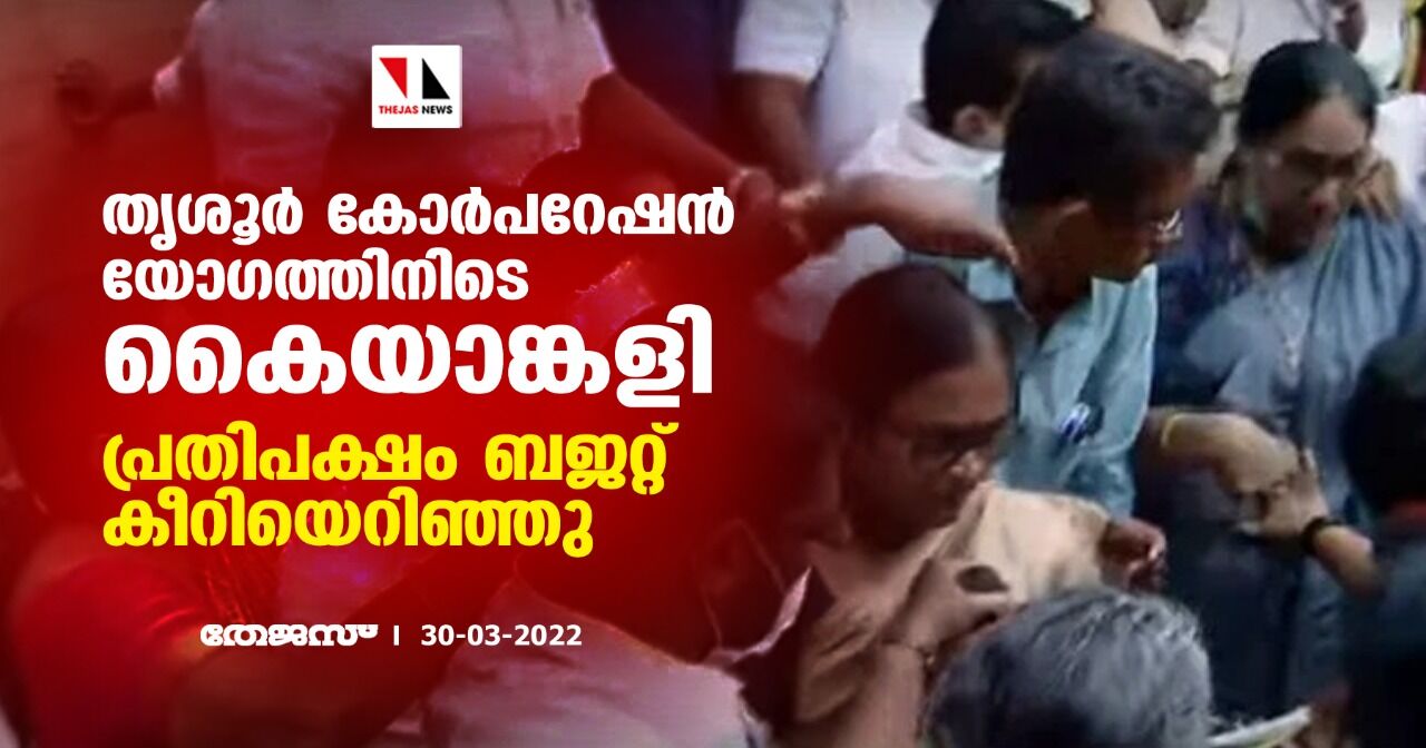തൃശൂര് കോര്പറേഷന് യോഗത്തിനിടെ കൈയാങ്കളി; പ്രതിപക്ഷം ബജറ്റ് കീറിയെറിഞ്ഞു