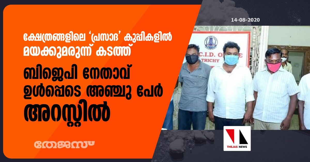 ക്ഷേത്രങ്ങളിലെ 'പ്രസാദ' കുപ്പികളില് മയക്കുമരുന്ന് കടത്ത്: ബിജെപി നേതാവ് ഉള്പ്പെടെ അഞ്ചു പേര് അറസ്റ്റില്