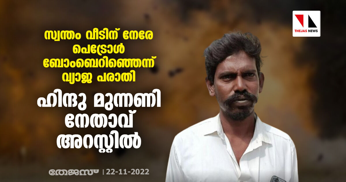 സ്വന്തം വീടിന് നേരേ പെട്രോള് ബോംബെറിഞ്ഞെന്ന് വ്യാജ പരാതി; ഹിന്ദു മുന്നണി നേതാവ് അറസ്റ്റില്
