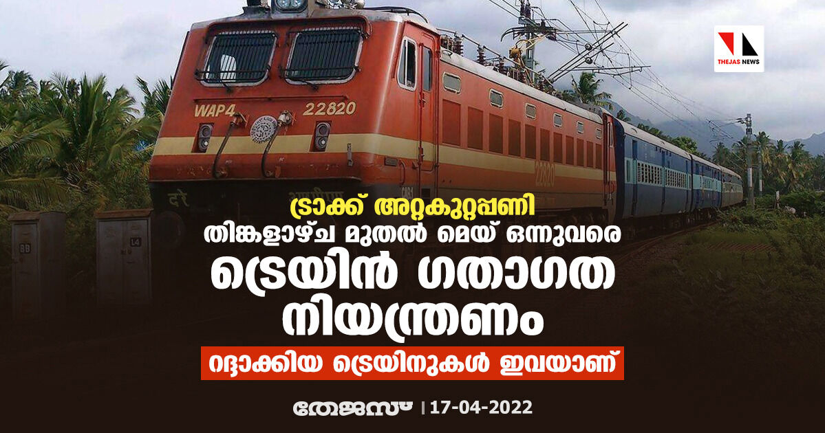 ട്രാക്ക് അറ്റകുറ്റപ്പണി: തിങ്കളാഴ്ച മുതല് മെയ് ഒന്നുവരെ ട്രെയിന് ഗതാഗത നിയന്ത്രണം; റദ്ദാക്കിയ ട്രെയിനുകള് ഇവയാണ്