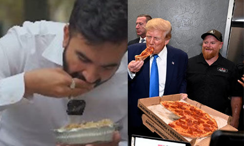 മംദാനി കൈകൊണ്ട് ഭക്ഷണം കഴിച്ചത് അമേരിക്കന് വിരുദ്ധമെന്ന് റിപ്പബ്ലിക്കന് നേതാവ്; ട്രംപ് പിസ കഴിക്കുന്ന ചിത്രം പങ്കുവച്ച് ഡെമോക്രാറ്റുകള്