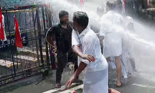 2018 ലെ പ്രളയം മനുഷ്യനിര്മിതമെന്ന് ആരോപിച്ച് കെ കൃഷ്ണന്കുട്ടിയുടെ ഓഫിസിലേക്ക് യുഡിഎഫ് മാര്ച്ച്; ജലപീരങ്കി പ്രയോഗിച്ച് പോലിസ്