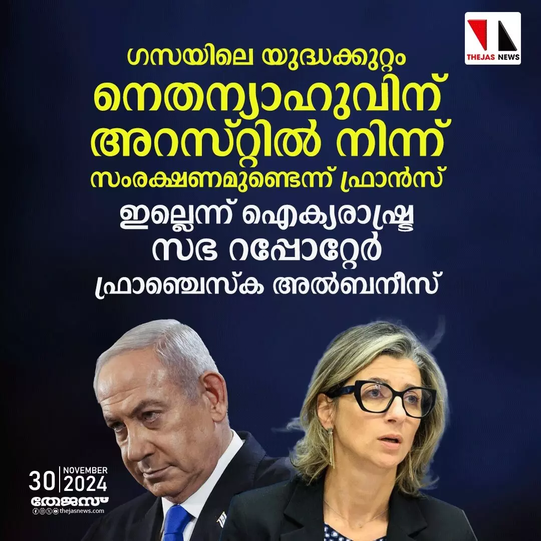 ഗസയിലെ യുദ്ധക്കുറ്റം: നെതന്യാഹുവിന് അറസ്റ്റില് നിന്ന് സംരക്ഷണമുണ്ടെന്ന് ഫ്രാന്സ്; ഇല്ലെന്ന് ഐക്യരാഷ്ട്ര സഭ റപ്പോറ്റേര് ഫ്രാഞ്ചെസ്ക അല്ബനീസ്