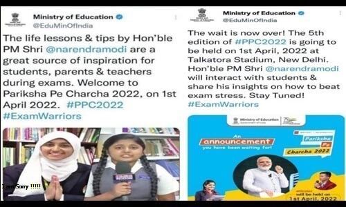 പരീക്ഷാ പേ ചര്ച്ച: ആദ്യ ട്വീറ്റില് നിന്ന് ഹിജാബ് ധരിച്ച മുസ്ലിം പെണ്കുട്ടിയുടെ ചിത്രം നീക്കം ചെയ്ത് കേന്ദ്ര വിദ്യാഭ്യാസ മന്ത്രാലയം