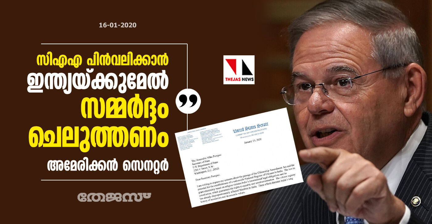 സിഎഎ പിന്വലിക്കാന് ഇന്ത്യയ്ക്കുമേല് സമ്മര്ദ്ദം ചെലുത്തണം; അമേരിക്കന് സെനറ്റര്