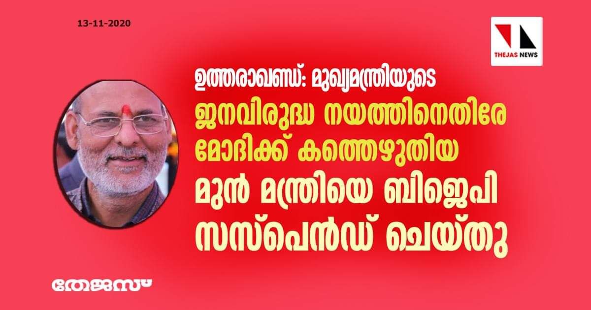 ഉത്തരാഖണ്ഡ്: മുഖ്യമന്ത്രിയുടെ ജനവിരുദ്ധ നയത്തിനെതിരേ മോദിക്ക് കത്തെഴുതിയ മുൻ മന്ത്രിയെ ബിജെപി സസ്പെൻഡ് ചെയ്തു