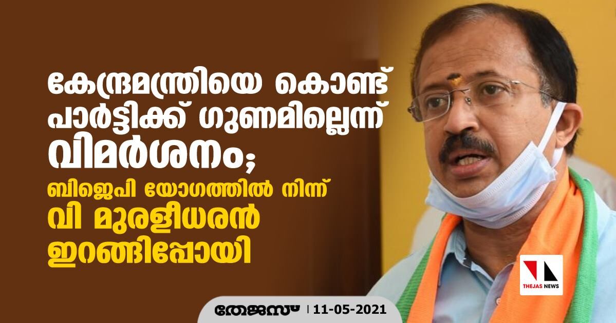 കേന്ദ്രമന്ത്രിയെ കൊണ്ട് പാര്ട്ടിക്ക് ഗുണമില്ലെന്ന് വിമര്ശനം; ബിജെപി യോഗത്തില് നിന്ന് വി മുരളീധരന് ഇറങ്ങിപ്പോയി
