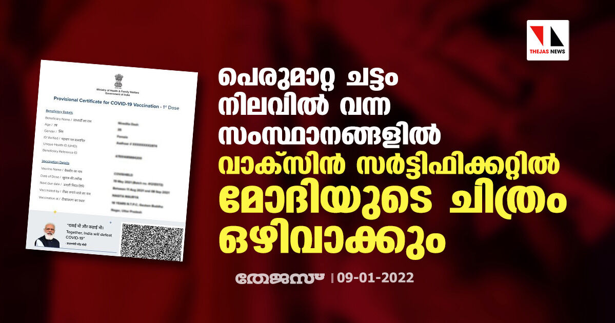 തിരഞ്ഞെടുപ്പ് നടക്കുന്ന അഞ്ച് സംസ്ഥാനങ്ങളിൽ പെരുമാറ്റച്ചട്ടം നിലവിൽ വന്നതിനാൽ ഇവിടങ്ങളിലുള്ള ജനങ്ങൾക്ക് നൽകുന്ന കൊവിഡ് വാക്സിനേഷൻ സർട്ടിഫിക്കറ്റിൽ നിന്ന് പ്രധാനമന്ത്രി നരേന്ദ്ര മോദിയുടെ ചിത്രം ഒഴിവാക്കും