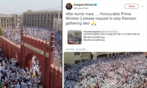 നടി കങ്കണാ റണാവത്തും വീഡിയോ ട്വീറ്റ് ചെയ്തിരുന്നു. കുംഭമേളക്ക് ശേഷം ബഹുമാനപ്പെട്ട പ്രധാനമന്ത്രി ജി റമദാന് കൂടിച്ചേരലകളും അവസാനിപ്പിക്കണമെന്ന് അപേക്ഷിക്കുന്നു എന്ന അടിക്കുറിപ്പോടെയാണ് കങ്കണ റണാവത്ത് വീഡിയോ ഷെയര് ചെയ്തത്. എന്നാല്, പ്രചാരണം വ്യാജമാണെന്ന് തെളിഞ്ഞതോടെ താരം ട്വീറ്റ് ഡിലീറ്റ് ചെയ്തു.