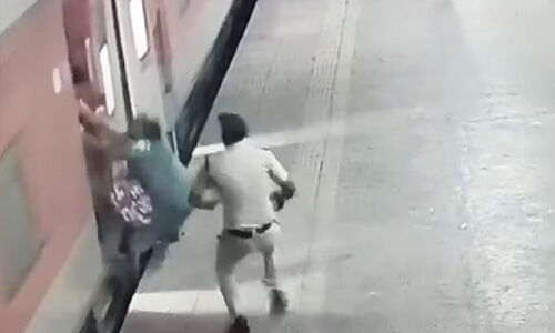 महाराष्ट्र के बोरीवली रेलवे स्टेशन पर एक महिला चलती ट्रेन से उतरते समय असंतुलित होकर गिर पड़ी। वहां मौजूद रेलवे सुरक्षाकर्मी ने तत्परता दिखाते हुए उसे बचा लिया।
