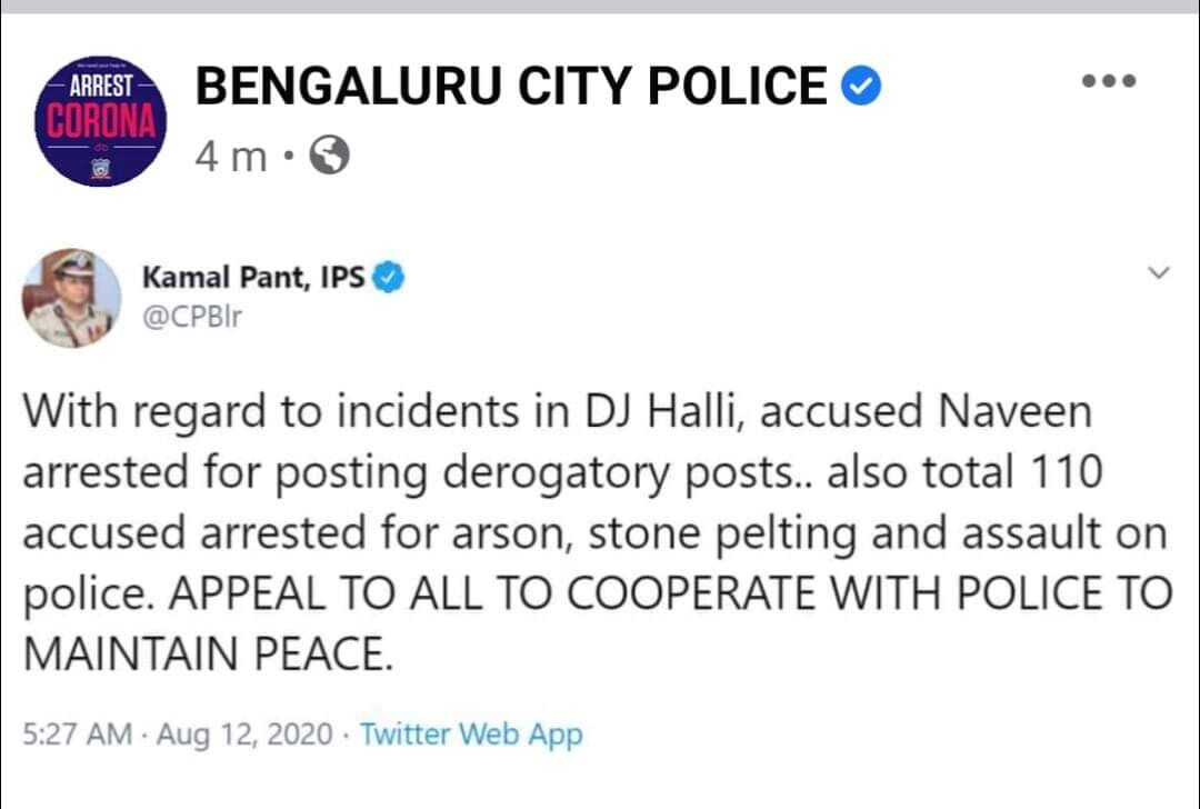 പുലികേശി നഗറിലെ കോണ്ഗ്രസ് എംഎല്എ അഖണ്ഡ ശ്രീനിവാസ മൂര്ത്തിയുടെ സഹോദരിയുടെ മകന് നവീനാണ് ഫേസ്ബുക്കില് പ്രവാചകന് മുഹമ്മദ് നബിയെ അവഹേളിക്കുന്ന പോസ്റ്റിട്ടത്. നവീനെ അറസ്റ്റ് ചെയ്യണമെന്നാവശ്യപ്പെട്ട് തെരുവിലിറങ്ങിയ ആളുകള് നവീെന്റ കാറടക്കം നിരവധി വാഹനങ്ങള് കത്തിച്ചു. എം.എല്.എയുടെ വീടിനുനേരെയും കല്ലേറുണ്ടായി. കല്ലേറില് വീടിെന്റ ജനല് ചില്ലുകളടക്കം തകര്ന്നു. നവീെന്റ അറസ്റ്റ് ആവശ്യപ്പെട്ട് ഡിജെ ഹള്ളി, കെജി ഹള്ളി പൊലീസ് സ്റ്റേഷനുകളുടെ മുന്നിലും ആളുകള് തടിച്ചുകൂടി. പോലിസ് സ്റ്റേഷനു നേരെയും കല്ലേറുണ്ടായി. പ്രതിഷേധക്കാര് നിരവധി വാഹനങ്ങള് കത്തിച്ചു. എംഎല്എ അഖണ്ഡ ശ്രീനിവാസ മൂര്ത്തിയുടെ വീടിനു നേരെയാണ് ആദ്യം ആക്രമണമുണ്ടായത്. നൂറോളം പേര് വീടിനു നേരെ കല്ലെറിയുകയും അതിക്രമിച്ചു കടക്കുകയുമായിരുന്നു. എംഎല്എയുടെ വീടും ഓഫിസും ആക്രമിച്ചതിനൊപ്പം 15ഓളം വാഹനങ്ങള് കത്തിക്കുകയും ചെയ്തു.