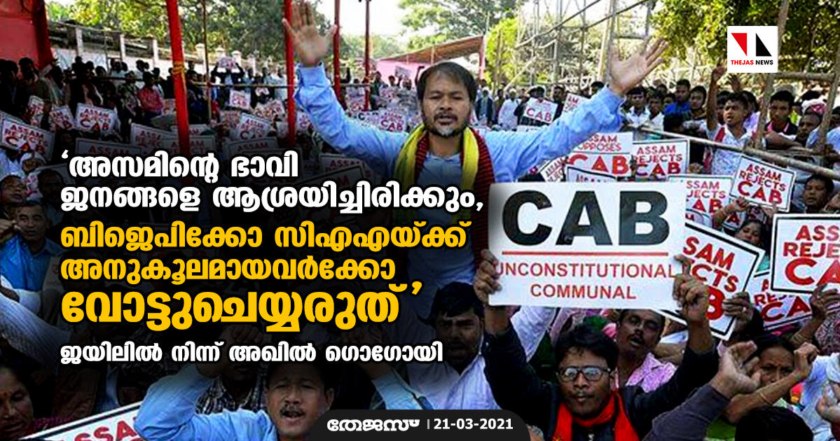 'അസമിന്റെ ഭാവി ജനങ്ങളെ ആശ്രയിച്ചിരിക്കും, ബിജെപിക്കോ സിഎഎയ്ക്ക് അനുകൂലമായവര്ക്കോ വോട്ടുചെയ്യരുത്': ജയിലില് നിന്ന് അഖില് ഗൊഗോയി
