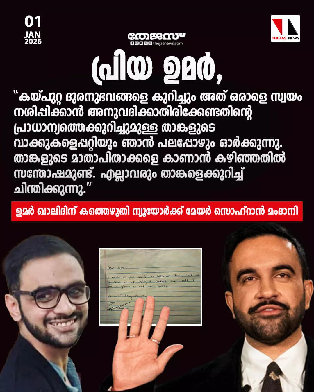 ''എല്ലാവരും താങ്കളെക്കുറിച്ച് ചിന്തിക്കുന്നു.'' ഉമര് ഖാലിദിന് കത്തെഴുതി ന്യൂയോര്ക്ക് മേയര് സൊഹ്റാന് മംദാനി