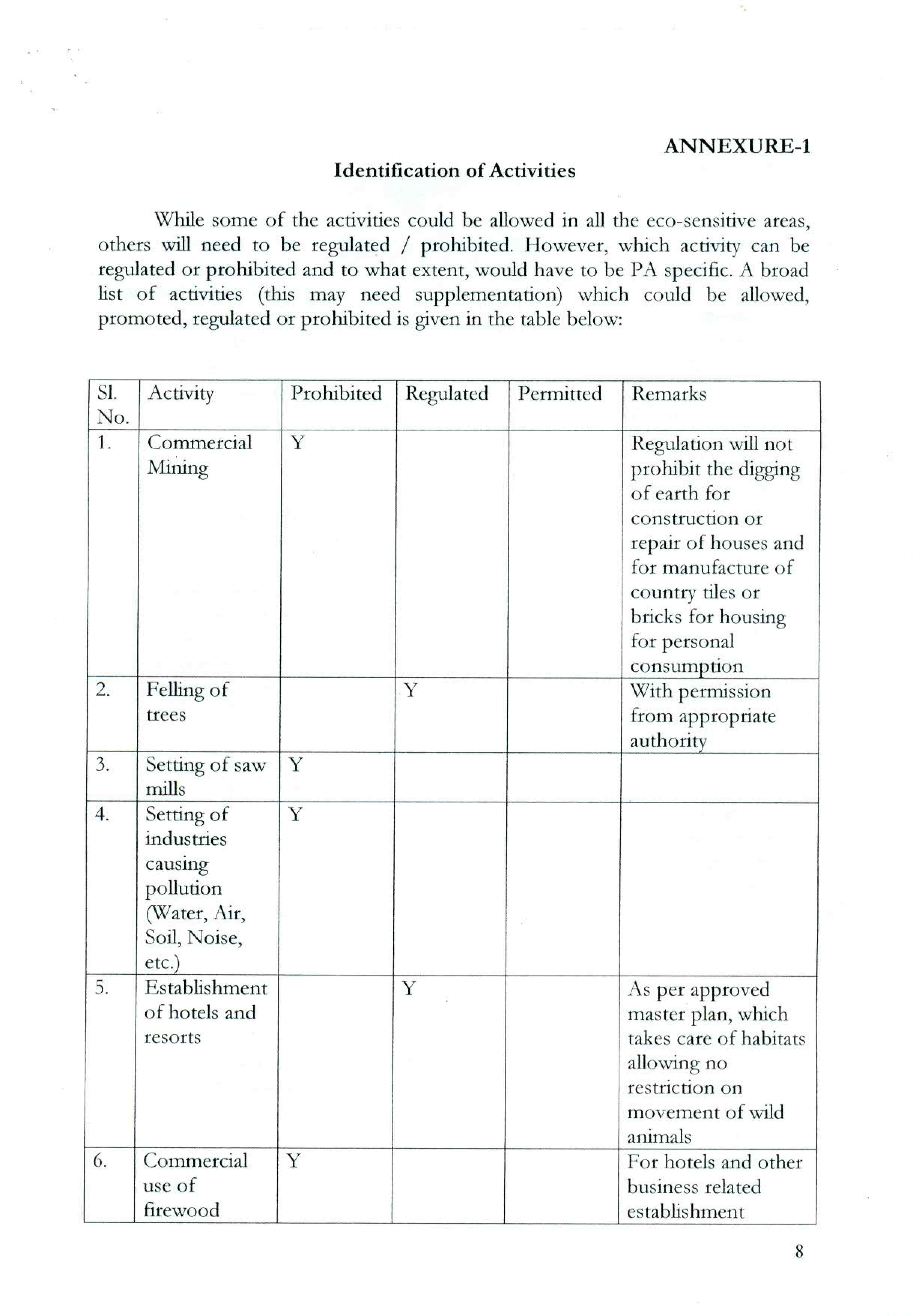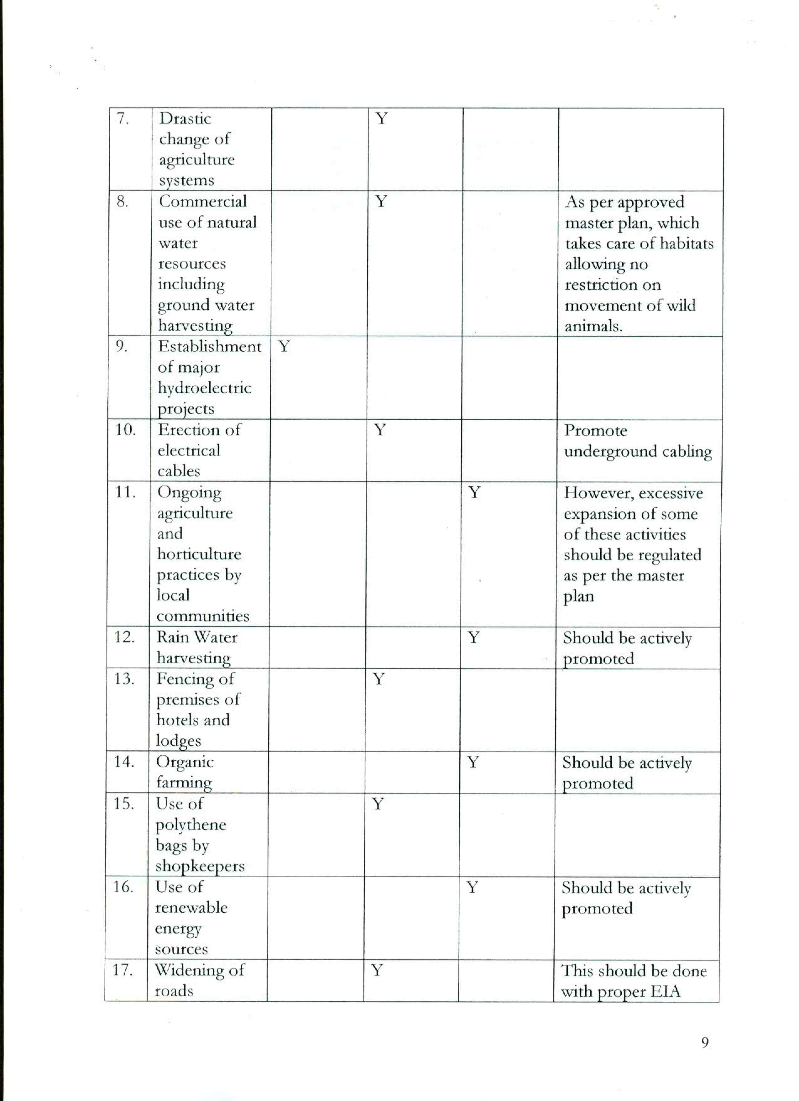 ഹോട്ടലുകളുടേയും റിസോർട്ടുകളുടേയും പ്രവർത്തനം, വന്യമൃഗങ്ങളുടെ ചലനത്തെ തടസപ്പെടുത്താതെയുള്ള ആവാസ വ്യവസ്ഥകളെ പരിപാലിക്കുന്ന അംഗീകൃത മാസ്റ്റർ പ്ലാൻ അനുസരിച്ചുള്ള പ്രവർത്തനങ്ങളാകാം.