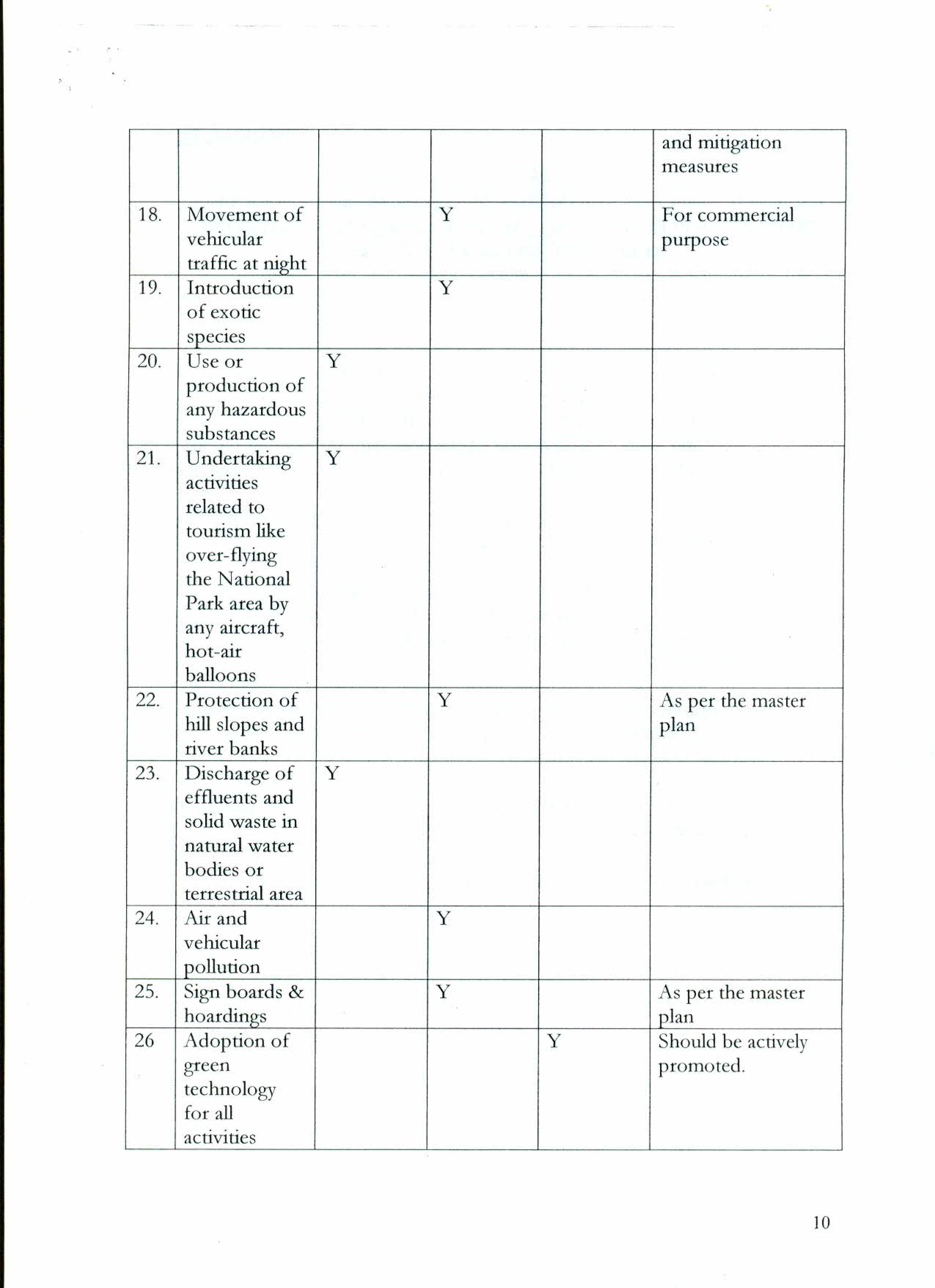 പ്രകൃതിദത്ത ജലാശയങ്ങളും ഭൂഗർഭജലവും വ്യാവസായിക ആവശ്യങ്ങൾക്ക് ഉപയോഗിക്കാൻ സാധിക്കില്ല. വന്യമൃഗങ്ങളുടെ ചലനത്തെ തടസപ്പെടുത്താതെയുള്ള ആവാസ വ്യവസ്ഥകളെ പരിപാലിക്കുന്ന അംഗീകൃത മാസ്റ്റർ പ്ലാൻ അനുസരിച്ചുള്ള പ്രവർത്തനങ്ങളാകാം.