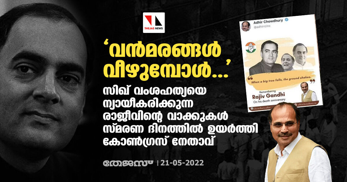 ന്യൂഡല്ഹി: രാജീവ് ഗാന്ധിയുടെ ചരമദിനത്തില് അദ്ദേഹത്തിന്റെ വിവാദമായ വാക്കുകള് ട്വീറ്റ് ചെയ്ത് കോണ്ഗ്രസ് നേതാവ് അധീര് രഞ്ജന് ചൗധരി. വന്മരങ്ങള് വീഴുമ്പോള് നിലം കുലുങ്ങും എന്ന വാക്കുകള് ചേര്ത്ത പോസ്റ്ററാണ് ചൗധരി ട്വീറ്റ് ചെയ്തത്. വിവാദമായതോടെ ഇതു ഡിലീറ്റ് ചെയ്തു.