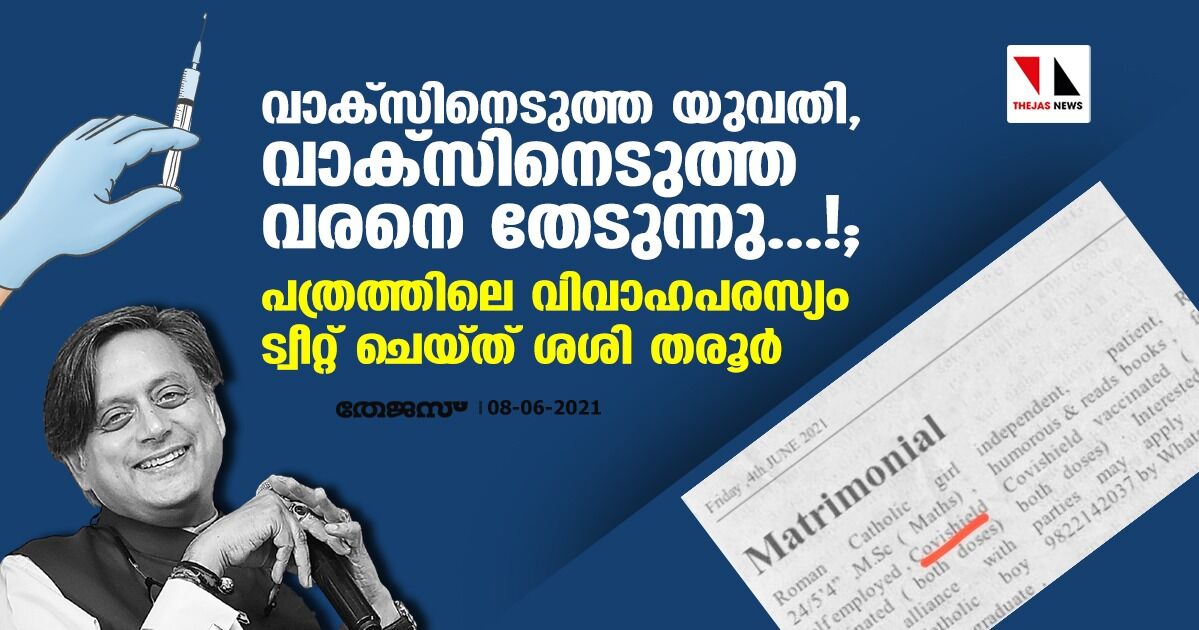 വാക്സിനെടുത്ത യുവതി, വാക്സിനെടുത്ത വരനെ തേടുന്നു...!; പത്രത്തിലെ വിവാഹപരസ്യം ട്വീറ്റ് ചെയ്ത് ശശി തരൂര്