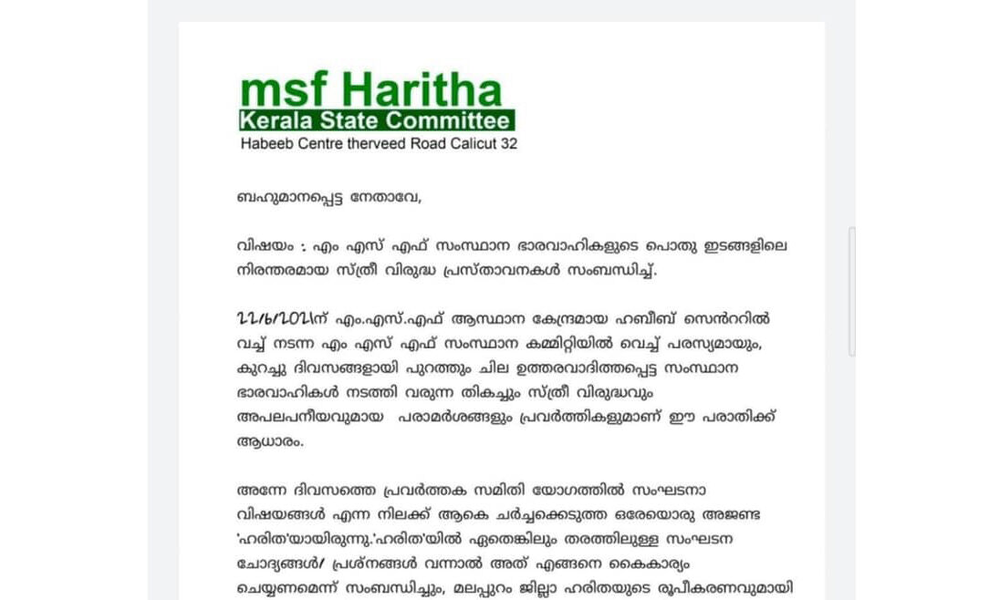 എംഎസ്എഫ് നേതാക്കള്ക്കെതിരേ ഗുരുതര ആരോപണങ്ങളുമായി വനിതാ വിഭാഗം; കത്ത് പുറത്ത്