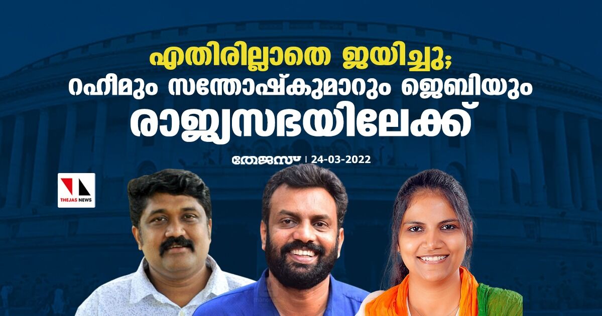 തിരുവനന്തപുരം: സിപിഎമ്മിലെ എ എ റഹീം, സിപിഐ അംഗം പി സന്തോഷ്കുമാര്, കോണ്ഗ്രസിലെ ജെബി മേത്തര് എന്നിവര് രാജ്യസഭയിലേക്ക് എതിരില്ലാതെ തിരഞ്ഞെടുക്കപ്പെട്ടു. എതിര് സ്ഥാനാര്ഥികള് ഇല്ലാത്തതിനാല് മൂവരേയും വിജയികളായി പ്രഖ്യാപിച്ചു.