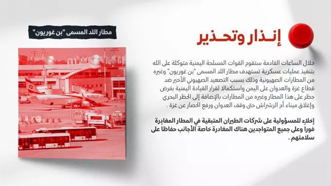 അതേസമയം, ബെന്ഗുരിയോണ് വിമാനത്താവളത്തിലെ എല്ലാ വിമാനങ്ങളും എടുത്തുമാറ്റണമെന്ന് അന്സാറുല്ല ഇന്ന് വൈകീട്ട് പ്രസ്താവനയില് ആവശ്യപ്പെട്ടു. വിമാനത്താവളത്തിലുള്ള എല്ലാവരും പ്രത്യേകിച്ച്, വിദേശികള് ഒഴിഞ്ഞുപോവണമെന്നും പ്രസ്താവന പറയുന്നു.
