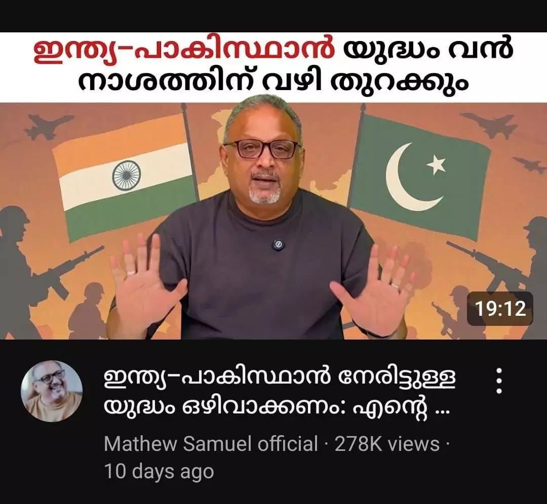 നേരത്തെ ഈ വീഡിയോക്കെതിരെ പാലക്കാട് അലനല്ലൂര് സ്വദേശിയായ അഡ്വ. മുഹമ്മദ് സബീര് പോലിസില് പരാതി നല്കിയിരുന്നു. ''മുന്പ് മതസ്പര്ദ്ധ ഉണ്ടാക്കുന്ന തരത്തില് വീഡിയോ ഇട്ടതിന് കേസ് ഉണ്ടായിരുന്നതും കേരള ഹൈക്കോടതി മുന്കൂര് ജാമ്യം അനുവദിച്ച വ്യക്തിയുമാണ് മേല് സൂചിപ്പിച്ച വീഡിയോ പോസ്റ്റ് ചെയ്ത ആള്. ഇത് രാജ്യത്തിന്റെ ഐക്യത്തിനും അഖണ്ഡതക്കും എതിരാണ്. രാജ്യത്തിന്റെ പരമാധികാരം ചോദ്യം ചെയ്യപ്പെടുന്നതും രാജ്യത്തിന്റെ സൈനിക ശക്തിയെ അപഹാസ്യമാക്കുന്നതുമാണ്. ആകയാല് മേപ്പടി മാത്യു സാമൂവല് എന്നവര്ക്കെതിരെ യുക്തമായ നിയമ നടപടികള് കൈകൊള്ളാന് അപേക്ഷിക്കുന്നു.''-ഡിജിപിക്ക് നല്കിയ പരാതി പറയുന്നു.