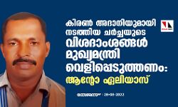 കിരണ് അദാനിയുമായി നടത്തിയ ചര്ച്ചയുടെ വിശദാംശങ്ങള് മുഖ്യമന്ത്രി വെളിപ്പെടുത്തണം: ആന്റോ ഏലിയാസ്