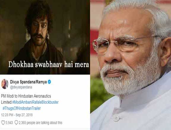 റഫാല് കരാറില് അനില് അംബാനിയുടെ റിലയന്സ് ഡിഫന്സിനു വേണ്ടി മോദി ഒഴിവാക്കിയ ഹിന്ദുസ്ഥാന് എയറോനോട്ടിക്സ് ലിമിറ്റഡ് പ്രധാനമന്ത്രിയോട് ചോദിക്കുന്നതായി കാണിച്ചാണ് ദിവ്യ ഈ ഡയലോഗ് ഉപയോഗിച്ചിരിക്കുന്നത്. ട്വീറ്റ് ഇതിനകം തന്നെ വൈറലായിട്ടുണ്ട്. നേരത്തെ മോദിയുടെ മുഖത്ത് ചോര് എന്നെഴുതിയ ചിത്രം ട്വീറ്റ് ചെയ്ത ദിവ്യക്കെതിരേ രാജ്യദ്രോഹക്കുറ്റത്തിന് കേസെടുത്തിരുന്നു.