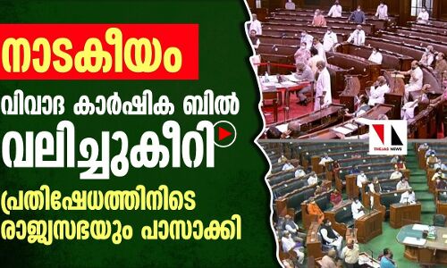 വിവാദ കാര്ഷികബില്ലുകള് രാജ്യസഭയില് പ്രതിപകഷം വലിച്ചുകീറി. രാജ്യസഭാ ഉപാധ്യക്ഷന്റെ ഡയസിലേക്ക് ഇരച്ചുകയറിവര് മൈക്ക് തകര്ത്തു. പ്രതിഷേധങ്ങള്ക്കിടെ ശബ്ദവോടോടോടെ രണ്ടുബില്ലുകള് പാസാക്കി