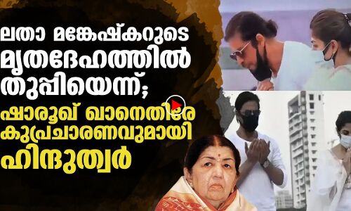 ഗായിക ലതാ മങ്കേഷ്കറിന്റെ മൃതദേഹത്തിനരികിൽ ദുആ ചെയ്ത ഷാരൂഖ് ഖാനെതിരേ ഹിന്ദുത്വരുടെ വിദ്വേഷപ്രചാരണം. ലതയുടെ മൃതദേഹത്തിരികിൽ കൈ ഉയർത്തി ദുആ ചെയ്ത ബോളിവുഡ് താരം ഷാരൂഖ് ഖാൻ തുപ്പിയെന്നാണ് ട്വിറ്ററിലൂടെയും ഫേസ്ബുക്കിലൂടെയും പ്രചാരണം നടക്കുന്നത്