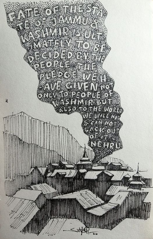 കാശ്മീരിന്റെ സ്വയം നിര്ണ്ണയാവകാശത്തെ കുറിച്ച് നെഹ്രു നല്കിയ വാഗ്ദാനം കരിമ്പുകയായി അന്തരീക്ഷത്തില് ഇപ്പോഴുമുണ്ട് എന്ന് ഓര്മിപ്പിക്കുന്ന സുഹൈലിന്റെ കാര്ടൂണ് കാശ്മീരിലെ എല്ലാ പ്രശ്നങ്ങളുടെയും അടിസ്ഥാന കാരണം എന്താണെന്ന് വ്യക്തമാക്കുന്നതാണ്.