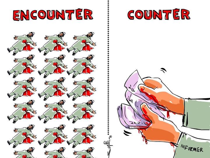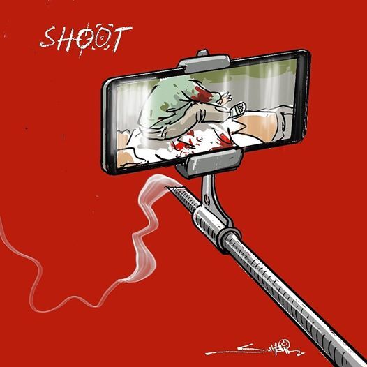 പേരക്കുട്ടിയോടൊപ്പം ഉണ്ടായിരുന്ന മുത്തഛനെ ഭീകരര് വെടിവെച്ചു കൊന്നപ്പോള് കുട്ടിയെ സാഹസികമായി രക്ഷപ്പെടുത്തി എന്ന സൈന്യത്തിന്റെ അവകാശവാദത്തെ പരിഹസിക്കുന്ന സുഹൈല് നഖ്ഷ്ബന്ധിയുടെ കാര്ട്ടൂണ് വളരെ ശക്തമാണ്. തോക്കിന്കുഴലില് ഘടിപ്പിച്ച ക്യാമറയിലെ ചിത്രം യഥാര്ഥത്തില് എന്താണ് സംഭവിച്ചതെന്ന് വ്യക്തമായി തന്നെ പറയുന്നുണ്ട്.